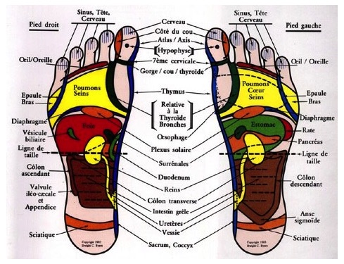 En réflexologie, les pieds ou les mains sont une représentation en miniature du corps. Chaque zone réflexe du pied ou de la main correspond à un organe, une glande ou une partie du corps.